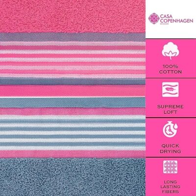 The Casa Copenhagen Germany Design “He & She” Super Soft Collection includes 2 large bath towels made from 100% premium cotton, offering exceptional softness, high absorbency, and long-lasting comfort for daily use. Each towel measures 70 × 140 cm, providing generous full-body coverage ideal for both men and women. Designed in elegant Dusty Blue and Pink shades, this pair adds a stylish and modern touch to any bathroom décor. The breathable cotton fabric absorbs moisture quickly while drying fast, ensuring a fresh and hygienic experience after every bath, gym session, or spa visit. Durable and gentle on the skin, these towels maintain their plush texture and color even after multiple washes, making them a luxurious and practical choice for everyday bathing comfort.