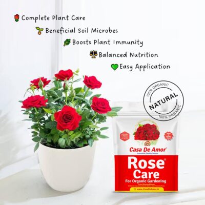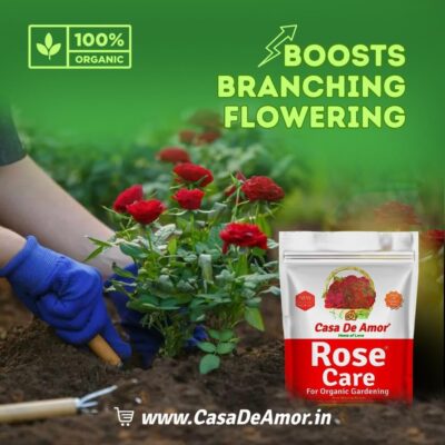 Casa De Amor Rose Care Fertilizer is a 100% organic, NPK-rich bloom and root booster specially formulated to meet the unique nutritional needs of rose plants. This premium fertilizer supports strong root development, sturdy stems, and lush green foliage while encouraging more buds, vibrant blooms, and longer-lasting flowers. Its balanced nutrient composition helps improve soil fertility, enhances nutrient absorption, and reduces bud drop, ensuring healthier and more resilient rose plants. Ideal for home gardens, terrace gardens, pots, and outdoor rose beds, this chemical-free fertilizer is safe for regular use and promotes sustainable plant care. Packed in a 900-gm pack, Casa De Amor Rose Care Fertilizer keeps your roses thriving with rich color, strength, and natural beauty.
