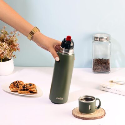 The Cello Duro Cup Style Thermosteel Flask is a 750ml military green insulated bottle that keeps drinks hot or cold for up to 24 hours. Designed with a dual-purpose cup and cap, it’s perfect for tea, coffee, or hydration on the go.