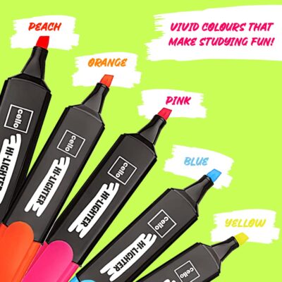 Cello Highlighter Pack of 5 offers bright multicolor markers designed for smooth highlighting in notes, textbooks and office documents. Long-lasting ink and chisel tips ensure clean, precise marking.