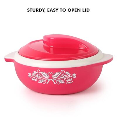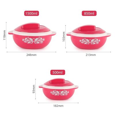 CELLO Hot Serve Insulated Inner Steel Casserole Set of 3 (Pink) is a perfect blend of style, durability, and everyday convenience for your kitchen and dining needs. This set includes three casseroles with capacities of 500 ml, 850 ml, and 1500 ml, making it ideal for serving chapati, roti, rice, curries, and gravies for small to large families. Designed with a high-quality stainless steel inner and double-wall insulation, these hot pots effectively lock in heat or cold for long hours, keeping food fresh and at the right temperature. The sturdy, well-fitted lid helps minimize heat loss and prevents spills, while the elegant pink exterior adds a vibrant and modern look to your dining table. Easy to clean, safe to handle, and suitable for daily use as well as special occasions, the CELLO Hot Serve casserole set is a reliable and stylish serving solution