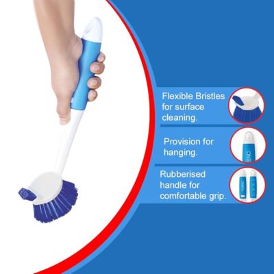 Cello Kleeno Dual Action Sink & Dish Brush, Blue & White is a practical and efficient cleaning tool designed to make dishwashing and sink cleaning easier and more thorough. Featuring flexible bristles that adapt to different surfaces, this brush helps remove food residues, grease, and stubborn stains from dishes, utensils, kitchen sinks, and basins with ease. It has a rubberized handle that provides a comfortable, non-slip grip, reducing hand fatigue during extended scrubbing tasks. The brush also includes a provision for hanging, so you can conveniently store it after use and keep your cleaning area organized. Made from durable plastic construction, it’s built to withstand regular use and handle everyday kitchen cleaning chores effectively.