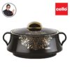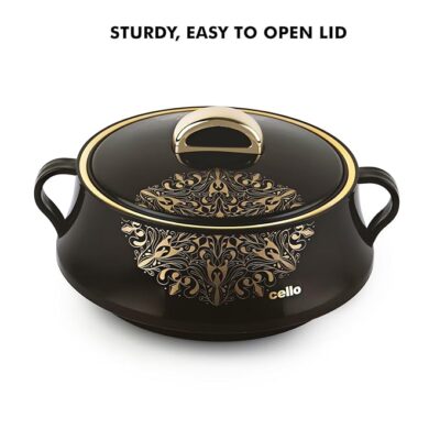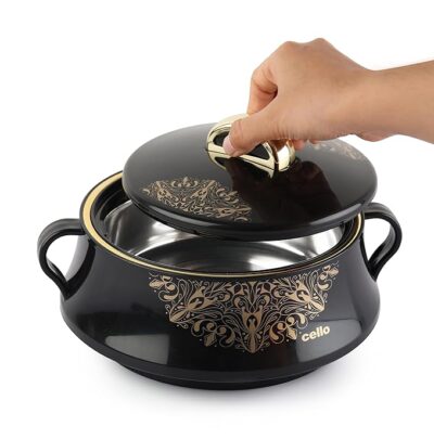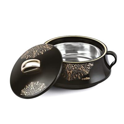 CELLO Midas Insulated Inner Steel Casserole for Roti (1500 ml, Black) is a premium and durable hot pot designed to keep your food fresh, hot, or cold for long hours. Made with a high-quality stainless-steel inner, it ensures better heat retention and maintains food hygiene, making it perfect for roti, chapati, rice, curries, and gravies. The advanced insulated double-wall design locks in temperature effectively, while the strong, well-fitted lid helps prevent heat loss and spills. Its elegant black finish gives a modern look to your kitchen and dining table. Easy to handle, easy to clean, and ideal for daily home use as well as special occasions, the CELLO Midas casserole combines style, performance, and convenience in one smart serving solution.