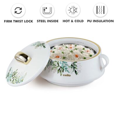 CELLO Midas Insulated Inner Steel Casserole for Roti (1500 ml, White) is a durable and elegant hot pot designed to keep your food fresh and at the right temperature for long hours. Built with a high-quality stainless steel inner and advanced insulated double-wall construction, it effectively locks in heat or cold, making it ideal for roti, chapati, rice, curries, and gravies. The well-fitted lid helps reduce heat loss and prevents spills, while the clean white finish adds a modern and hygienic look to your kitchen and dining table. Easy to clean, safe to handle, and perfect for daily home use or serving guests, the CELLO Midas casserole combines reliable performance with simple, classy design.