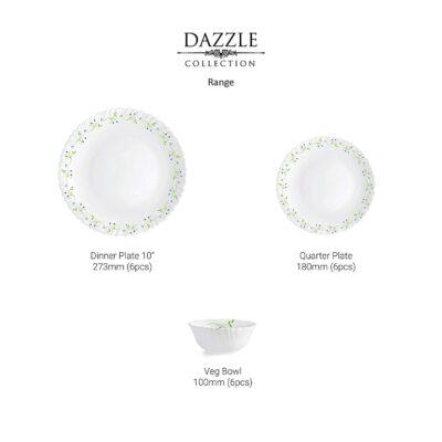 Elegant 18-piece opalware dinner set for 6, featuring full plates, quarter plates, and bowls. Lightweight, chip-resistant, bone-ash-free, and safe for microwave and dishwasher use. Ideal for daily meals and gifting.