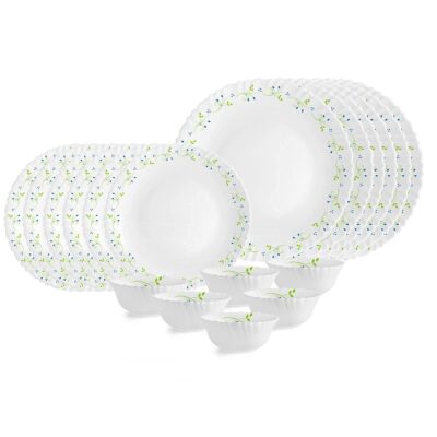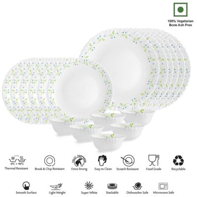 The Cello Opalware Tropical Lagoon Dinner Set is a stylish 18-piece crockery collection designed for modern dining. Made from premium opal glass, it is lightweight, durable, chip-resistant, and 100% bone-ash-free. Its smooth, non-porous surface prevents stains and makes cleaning effortless. Safe for both microwave and dishwasher use, this set is perfect for everyday meals, family dinners, and special occasions. With its refreshing tropical design, it adds elegance to your dining table and makes a thoughtful gift for loved ones.