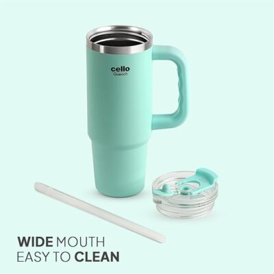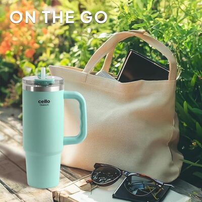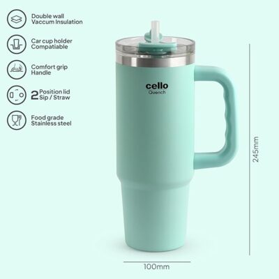 CELLO Quench 600 Stainless Steel Insulated Tumbler with Handle and Straw (550 ml, Mint) is a stylish and highly functional sipper designed for everyday hydration on the go. Crafted from premium stainless steel with advanced insulation technology, it keeps beverages hot or cold for long hours, making it ideal for coffee, tea, water, juices, and smoothies. The ergonomic handle ensures a comfortable grip, while the reusable straw lid allows easy, spill-resistant sipping. Designed to be cup holder compatible, it fits perfectly in your car, making it great for office, travel, gym, and daily commutes. Finished in a refreshing mint color, this tumbler combines durability, convenience, and modern style for a smart, eco-friendly drinking experience