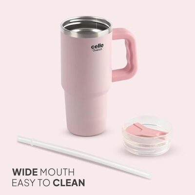 CELLO Quench Pro 900 Double Wall Insulated Tumbler with Handle and Straw (880 ml, Pink) is a premium, high-capacity sipper designed for all-day hydration and convenience. Made from ISI-certified, high-quality stainless steel with double-wall vacuum insulation, it effectively keeps beverages hot or cold for long hours, making it perfect for coffee, tea, water, juices, and smoothies. The sturdy ergonomic handle offers a comfortable grip, while the reusable straw lid ensures easy and spill-resistant sipping. Its cup holder–friendly design makes it ideal for office desks, car travel, and daily commutes. Finished in a stylish pink color, the CELLO Quench Pro 900 combines durability, safety, and modern design for a reliable and fashionable hydration companion.