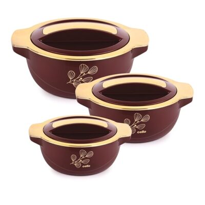 Case Box Set of 3 (Burgundy) is a stylish and practical solution for keeping your food warm and fresh for long hours. This set includes three casseroles with capacities of 500 ml, 1000 ml, and 1500 ml, making it ideal for serving roti, rice, biryani, curries, and other hot dishes for both small and large families. Designed with double-wall insulation, these hot pots effectively retain heat while keeping the outer surface cool and safe to handle. The elegant burgundy finish adds a premium look to your dining table, while the sturdy build ensures durability for everyday use. Easy to clean and convenient to store, the CELLO Radiant casserole set is perfect for home dining, parties, and special occasions, combining functionality with modern aesthetics