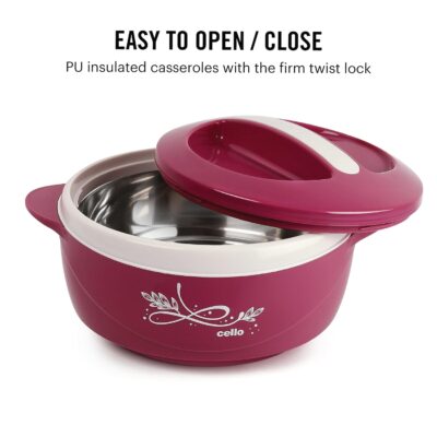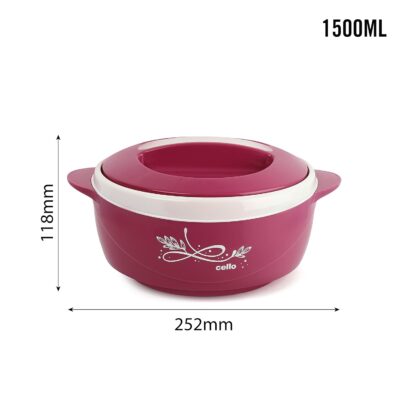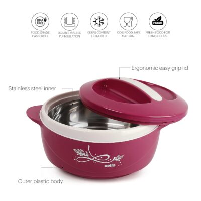 Serve piping hot rotis, rice, and curries anytime with the Cello Sapphire 1250 ml Casserole. Featuring double-walled stainless-steel insulation and a durable BPA-free body, it keeps food hot or cold for long hours while adding a stylish pink touch to your dining table.