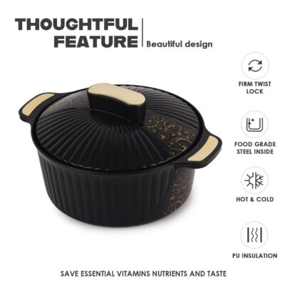 Cello Sonet Inner Stainless Steel Insulated Casserole (1250 ml, Black) | Double-Walled Hot Pot | Twist-Lock Airtight Lid | Easy-Grip Handle | Keeps Food Hot for Hours | Ideal for Kitchen & Gifting