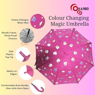 Make rainy days magical with the Colour Changing Magic Umbrella for Kids! Designed with special colour-changing technology, the umbrella’s cute cartoon prints transform into bright colours when they get wet, making rain fun and exciting for children. Its sturdy, wind-resistant frame and safe plastic tips ensure durability and safety. The umbrella opens and closes easily, perfect for small hands, and the curved round handle offers a comfortable grip. With its lightweight 1-fold design and pinch-proof closure, this umbrella is ideal for boys and girls who need reliable and playful protection from rain and sun.