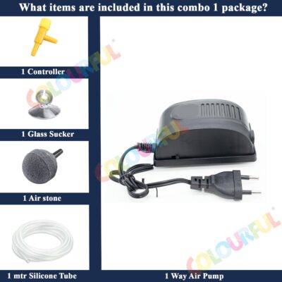 Ensure proper oxygenation in your aquarium or pond with the COLOURFUL Aquarium Air Pump (BL-106, 1-Way Combo-1). This mini aerator pump delivers 180 liters per hour of airflow with low power consumption (2.5W), making it both efficient and reliable.