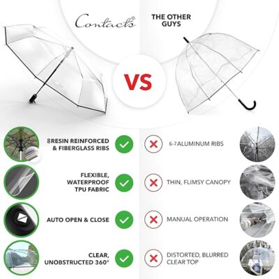 Contacts Transparent Windproof Travel Umbrella – Waterproof Clear Canopy, Strong Fiberglass Frame