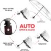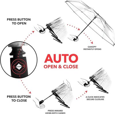 Transparent waterproof travel umbrella with a clear canopy, strong windproof fiberglass frame, and convenient auto open/close function. Lightweight, portable, and perfect for rain, wind, and everyday use.