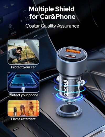 COSTAR 75W Car Charger Fast Charging (Blue) is a powerful and efficient in-car charging solution designed for today’s fast-paced, multi-device needs. Featuring dual fast-charging ports—a 45W Type-C QC port and a 30W USB Power Delivery (PD) port—it allows you to charge two devices simultaneously at high speed without performance loss. Ideal for tablets, smartphones, and other USB-enabled devices, this charger ensures stable and efficient power delivery even during long drives. It comes with a premium 2-meter Type-C to Type-C fast charging cable, offering added convenience and flexibility for rear-seat or dashboard use. Built with advanced safety protections against overcharging, overheating, and short circuits, and finished in a stylish blue design, the COSTAR 75W Car Charger combines power, safety, and convenience for a reliable on-the-road charging experience.