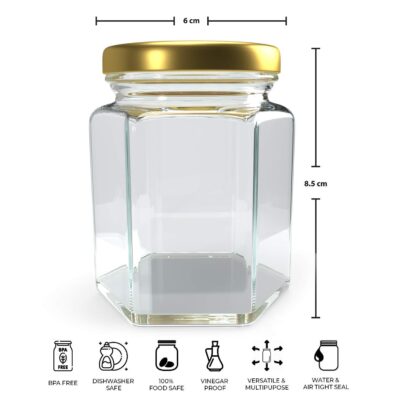 COTIT hexagon Design 250 Gram (ml) Glass jar with Airtight Black Lid for Masala Storage Jar, Candy, Spice, Kitchen Jar and Container (Gold lid, 6)