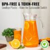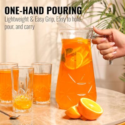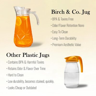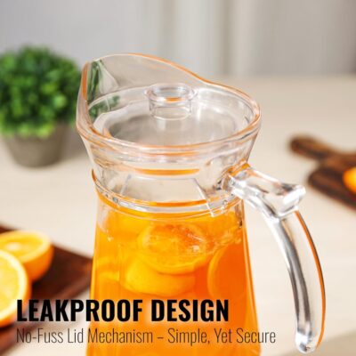 Its crystal-clear body beautifully displays colorful beverages and fresh ingredients, adding a touch of sophistication to your dining table or kitchen counter. The ergonomic easy-grip handle ensures comfortable, spill-free pouring even when the jug is full, while the tight-fit lid keeps your drinks fresh and hygienic.
