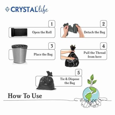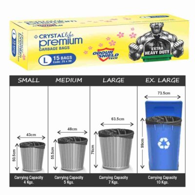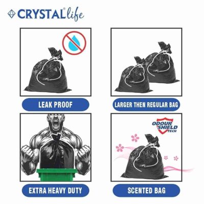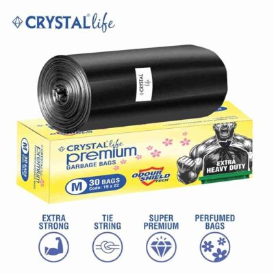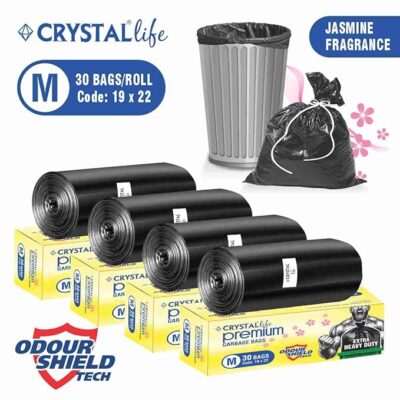 Crystal Plastic Premium Garbage Bags – Jasmine Fragrance (Medium 19 × 21 Inches, Pack of 120) are designed for strong, hygienic, and odor-controlled waste disposal. Made from premium-quality, tear-resistant plastic, these garbage bags securely handle both wet and dry waste without leaking or tearing. Infused with a pleasant jasmine fragrance, they help neutralize bad odors and keep your space fresh and clean. This value pack contains 120 bags (30 pieces per roll, 4 rolls total), offering long-lasting convenience for everyday use. The medium size fits most standard dustbins perfectly, while the black color ensures a neat and discreet appearance. Ideal for kitchens, bathrooms, offices, shops, and commercial spaces, these scented garbage bags combine strength, freshness, and practicality for daily waste management.