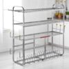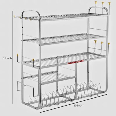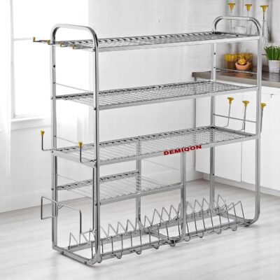 Keep your kitchen clutter-free with the DEMIQON Stainless Steel Heavy Duty Kitchen Rack, designed to combine functionality with durability. Featuring a 5-tier spacious design, it neatly organizes plates, bowls, cookers, and utensils in one convenient space.