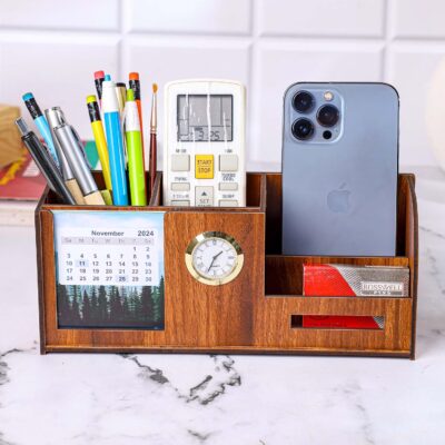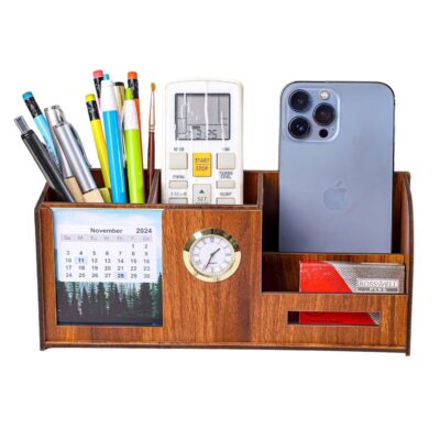 This Deskart Desk Organizer is designed with a multifunctional layout that includes a built-in calendar, clock, business card holder, mobile holder, and spacious pen compartment to keep daily essentials neatly arranged. Crafted from durable wood, it offers a rich brown finish that enhances the aesthetic of any office or study table. The integrated mobile stand provides a stable slot for phones, making it convenient to view notifications or attend calls hands-free. Its calendar and clock features add practical utility, allowing quick access to time and date without needing separate devices. The sleek structure ensures minimal desk clutter while adding a touch of sophistication to your workspace. Ideal for students, professionals, and home offices, it delivers style with efficient organization. This all-in-one organizer transforms your desk into a tidy, functional, and visually appealing setup.
