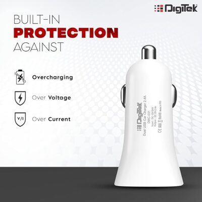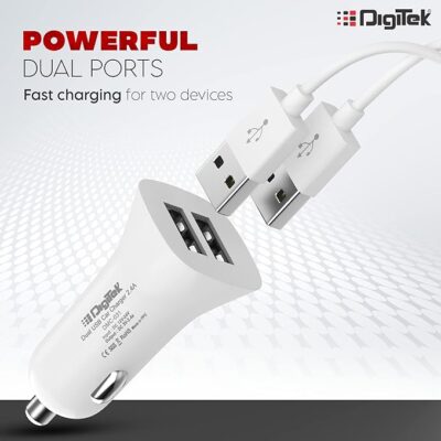 Digitek (DMC 031) Dual USB Fast Car Charger 2.4A, High-Speed Car Adapter with Multi Protection Compatible with Cars for iPhone & Android Smartphone, Power Bank, Smartwatch, Headphone