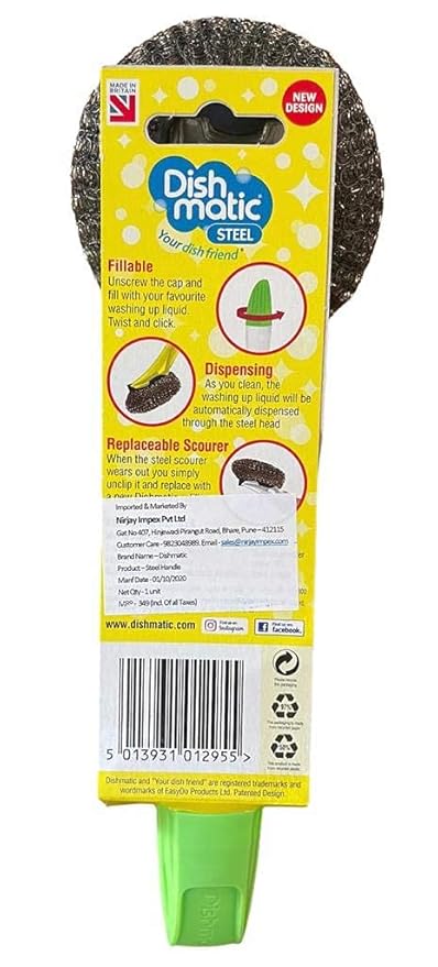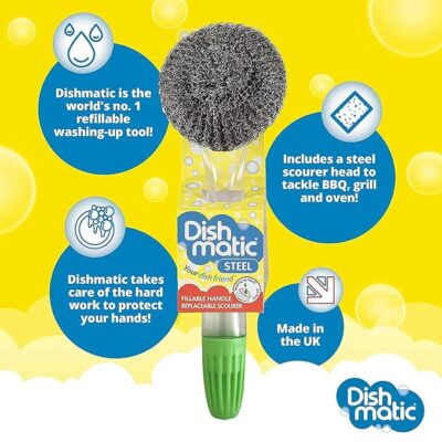 The Dish Matic Fillable Dish Wand Brush with Handle is a convenient and efficient dishwashing tool designed to make every day cleaning easier. Featuring a built-in soap dispensing system, this fillable and refillable dish wand allows detergent to flow directly onto the stainless-steel scrub, reducing effort and saving soap. The durable stainless-steel scrubber effectively removes grease, oil, and food residue from utensils, pots, pans, and dishes, while the ergonomic handle ensures a comfortable, non-slip grip and keeps hands away from water and heat. Easy to refill, simple to use, and quick to clean, this soap-dispensing steel scrubber is ideal for daily kitchen use and long-lasting performance.