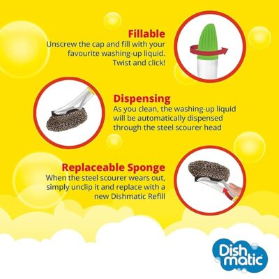 Dish Matic Fillable Dish Wand Brush with Handle for Dishwashing | Soap Dispensing Steel Scrubber for Utensils | Fillable and Refillable Dishwashing Tool with Stainless Steel Scrub (1)