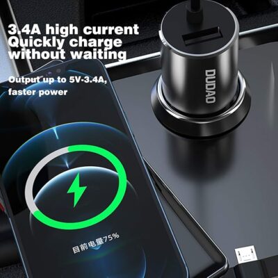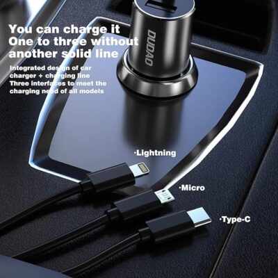 DUDAO R5PRON Premium Car Charger is a premium car charging adapter designed to keep your devices powered up efficiently during drives, with features that combine speed, convenience, and versatility. It sports a metallic body that’s both stylish and durable, while helping resist heat and wear for long-lasting use. The charger supports 3.4 A super-fast charging with Qualcomm 3.0 technology, delivering quick and reliable power to your compatible devices. What sets this model apart is its attached 3-in-1 cable, which includes Lightning, USB-C and Micro-USB connectors, so you don’t need to carry extra cables to juice up a variety of gadgets — whether it’s an iPhone, Android phone, earbuds, or other USB-powered devices. In addition to the built-in cable, there’s an extra USB port that lets you charge a second device at the same time, making it ideal for drivers and passengers alike. Its compact, travel-friendly design fits neatly into your car’s power socket and includes built-in safety protections against overcharging, overheating and short circuits, giving you peace of mind on the road.