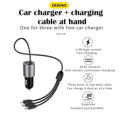 DUDAO R5PRON Premium Car Charger – Metallic Body, 3.4A Super Fast Car Charger with Attached 3-in-1 Cable, Additional USB Port, Qualcomm 3.0 Car Adapter, Compatible with iPhone & Android Devices.