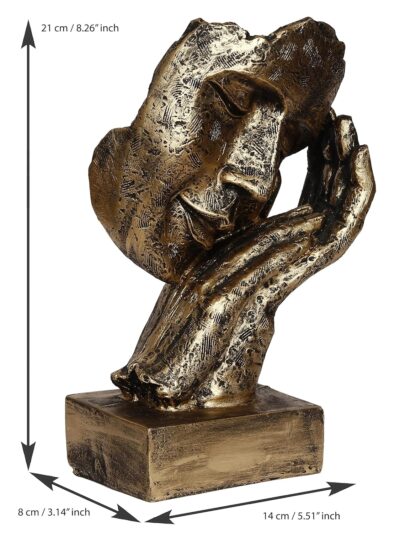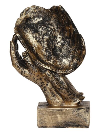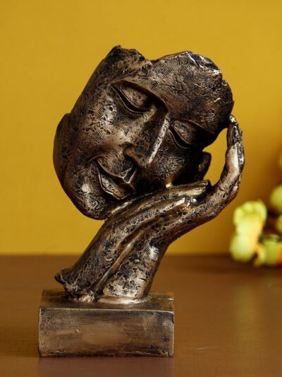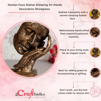 Add a touch of serenity to your décor with the eCraftIndia Golden Human Face Showpiece, featuring a peaceful face resting gently on folded hands. Crafted from premium resin in an antique gold finish, this handcrafted figurine enhances living rooms, bedrooms, mantels, and bedside tables with elegance and calm energy. An ideal gift for housewarmings, Diwali, weddings, corporate events, and birthdays, it serves as a soothing reminder of inner peace and self-care.