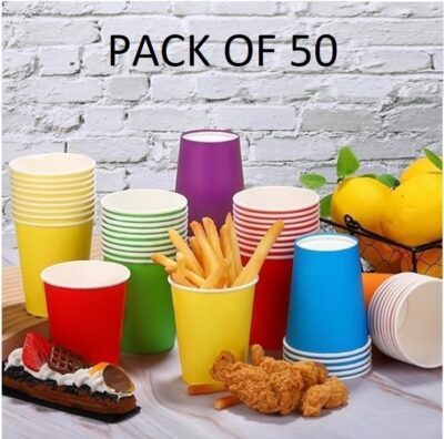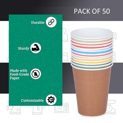 ekysa Basics Paper Disposable Tea/Coffee Cups (200 ml, Pack of 50) are eco-friendly, leak-resistant cups designed for safely serving hot beverages. Made from quality food-grade paper, these cups offer sturdy construction and comfortable handling without seepage. Featuring an attractive multicolor design, they are ideal for tea, coffee, and other hot drinks at homes, offices, meetings, events, and small gatherings. Hygienic and disposable, this pack of 50 cups provides a convenient and reliable solution for everyday beverage serving needs.
