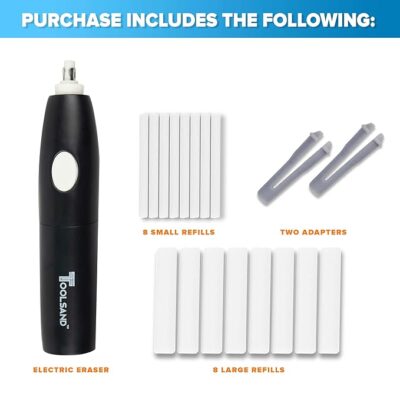 The Electric Pencil Eraser Kit is a convenient battery-operated tool designed for clean, precise, and effortless erasing. Ideal for writing, drawing, sketching, and drafting, it gently removes pencil marks without tearing or damaging paper. The pen-style ergonomic design offers excellent control, making it suitable for students, artists, and professionals alike. This kit comes with replaceable eraser refills to ensure long-lasting performance and consistent results. Finished in a sleek black color, the electric pencil eraser is perfect for everyday school use, creative artwork, and professional corrections.