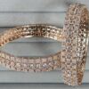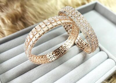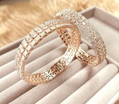 Chic set of 2 rose gold bangles with rhinestone-encrusted detailing, offering a sparkling and elegant touch to women’s fashion jewellery collections.