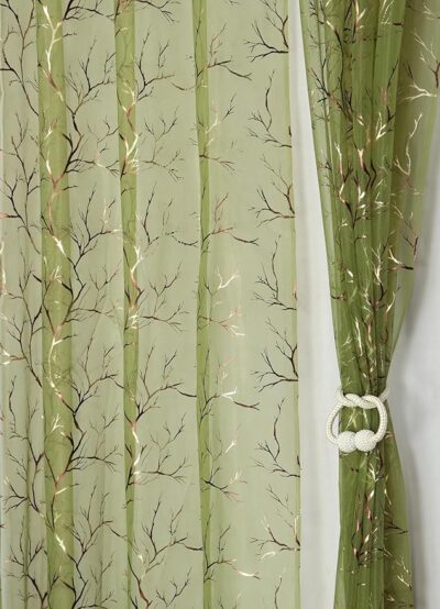 The fabric is a lightweight sheer with a foil-printed tree motif in green tones—offering a subtle shimmer and decorative accent while maintaining an airy, translucent feel.