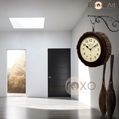 An elegant wooden round double-sided station wall clock with English and Roman numerals. Perfect for living rooms, offices, or as a stylish gift.