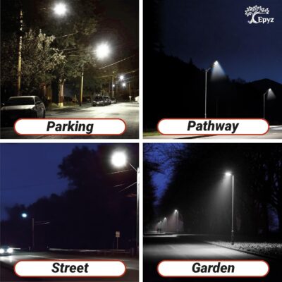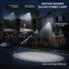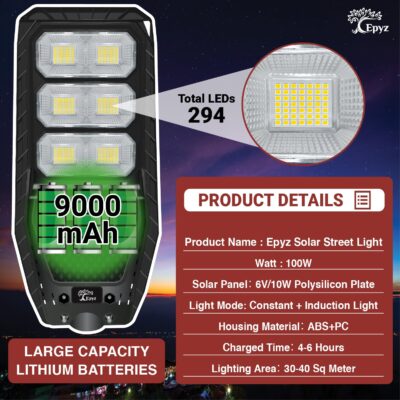 The Epyz 100W Solar Street Light offers bright cold white illumination with 294 LEDs and motion sensor for enhanced outdoor security. Featuring remote control and dusk-to-dawn functionality, it is ideal for gardens, streets, lawns, and pathways.