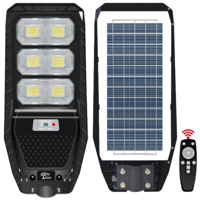The Epyz Plastic 100W Solar Street Light is designed to provide powerful and energy-efficient lighting for outdoor spaces. Equipped with 294 high-quality LEDs, it delivers bright cold white light that improves visibility and safety. The motion sensor activates the lamp when movement is detected, conserving energy during low activity periods. Dusk-to-dawn functionality ensures automatic operation from evening to morning without manual intervention. Remote control allows easy adjustment of settings and lighting modes from a distance. Made with durable waterproof materials, this street light performs reliably in various weather conditions, perfect for gardens, streets, lawns, and pathways.