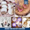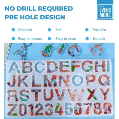 The EVENS MORE alphabet and number resin mould kit features hole-enabled moulds for making personalised keychains with glitter and multicolour effects. It is perfect for resin art projects, gifts, and decorative crafts.
