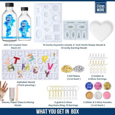 This EVENS MORE resin art kit includes alphabet and number moulds with pre-made holes, allowing users to create custom keychains with ease. The multicolour and glitter-friendly design helps add vibrant, eye-catching effects to each piece. It is compatible with epoxy resin, making it suitable for beginners and experienced crafters looking for personalised creations. The moulds are flexible and durable, enabling easy demoulding without damaging the resin pieces. This kit supports creative experimentation, allowing users to combine colours, glitters and other decorative elements for unique results. It is ideal for DIY gifts, school projects, and hobby crafting activities. The compact and versatile set ensures that small, detailed resin art pieces can be made efficiently while maintaining a smooth, professional finish.