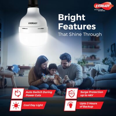 Eveready 30W Emergency Inverter LED Bulb delivers bright 6500K cool daylight for enhanced visibility and comfort.