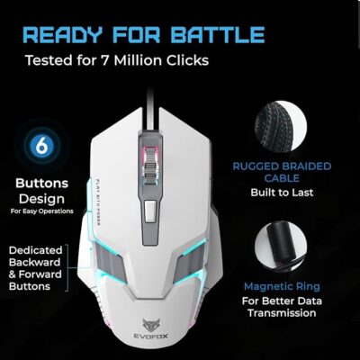 EvoFox Starter Series Specter USB Wired Gaming Mouse | up to 3600 DPI Gaming Sensor | 6 Buttons | Upto 7 Million Clicks | 7 Colors Rainbow Lighting with Breathing Effect | 1.5m Braided Cable (White)