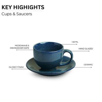 ExclusiveLane 'Ocean Ripples' Ceramic Tea Cup and Saucer Set of 6 (Studio Pottery, 120 ml, Blue, Microwave Safe) |Ceramic Cup Saucer Set of 6 for Tea Cups with Saucer Chai Cup Coffee Cup with Saucers
