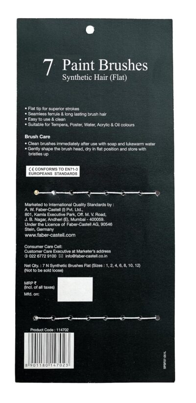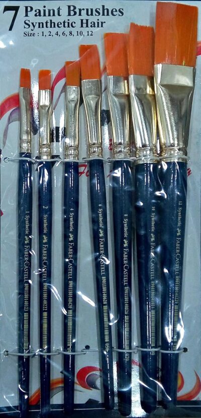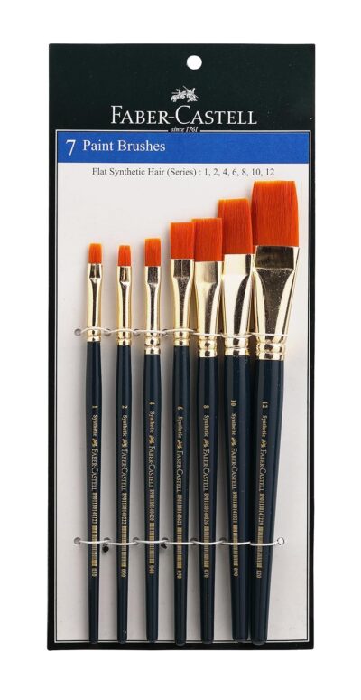 The Faber-Castell Flat Paint Brush Set comes with 7 high-quality brushes designed for smooth and controlled strokes. Each brush is crafted with durable bristles, anti-rusting ferrules, and a comfortable wooden handle, ensuring long-lasting performance. The set includes pony hair brushes ideal for watercolor painting and synthetic brushes suitable for tempera, poster, acrylic, and watercolor colors. Perfect for students, hobby artists, and professionals looking for reliable painting tools.