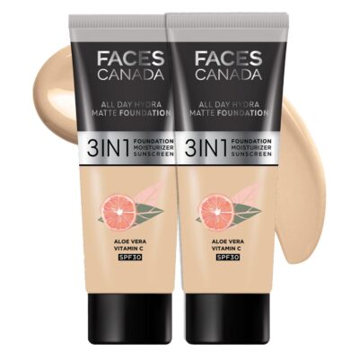 FACES CANADA All Day Hydra Matte Foundation (Absolute Ivory, Pack of 2) is a 3-in-1 formula that works as a foundation, moisturizer, and sun protector, giving you flawless skin with long-lasting hydration and coverage. Infused with Aloe Vera for 24-hour moisture and Vitamin C for a bright, healthy glow, it nourishes your skin while providing a smooth, even complexion. The SPF 30 protection shields your skin from harmful UV rays, while the matte, oil-free finish controls shine and keeps your skin fresh all day. Offering medium to high buildable coverage and up to 10 hours of wear, it conceals imperfections without feeling heavy or cakey. Suitable for all skin types, the FACES CANADA All Day Hydra Matte Foundation ensures a naturally radiant, hydrated, and long-lasting look with every use.