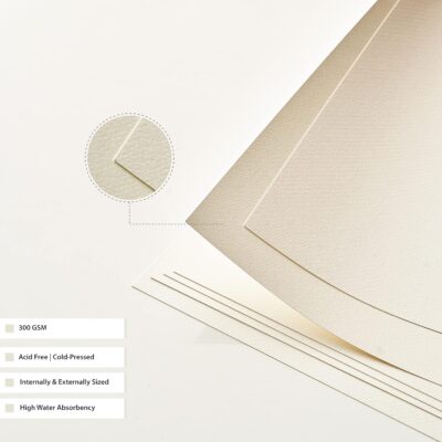 The Factor Notes A4 watercolor sheets are made with 300GSM thick, cold-pressed paper containing 30% cotton, providing excellent absorbency and texture for watercolor painting. The acid-free composition ensures long-lasting artwork without yellowing or deterioration. Each sheet offers a sturdy surface that supports detailed washes, layering, and blending techniques. The A4 size provides a convenient canvas for both small and medium-scale creative projects. With 9 sheets in the pack, artists have sufficient material for practice, studies, and finished paintings. The cold-pressed texture enhances brush control and adds a professional touch to watercolor artwork. This set is ideal for students, hobbyists, and professional artists seeking durable and high-quality watercolor paper.