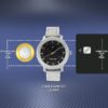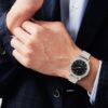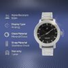 Stylish analog watch with a sleek black dial and durable silver metal strap.