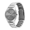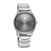 Sophisticated men’s watch with a grey dial and silver metal strap.