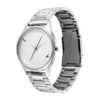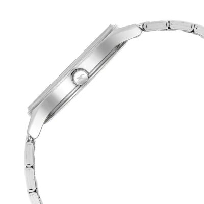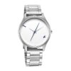 Elegant men’s watch with a crisp white dial and polished silver metal strap.