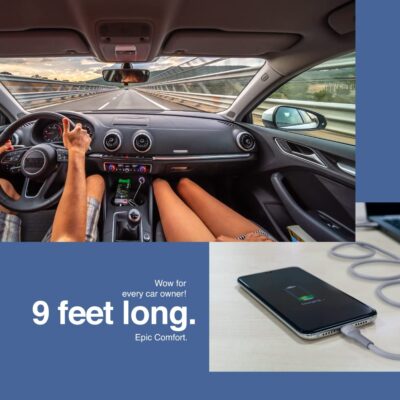 FINGERS Car Backseat-C9FL - Type-C Mobile Cable (9 feet long | Fast Charging up to 5.0 A Max | Fast Data Transfer) - Steel Grey